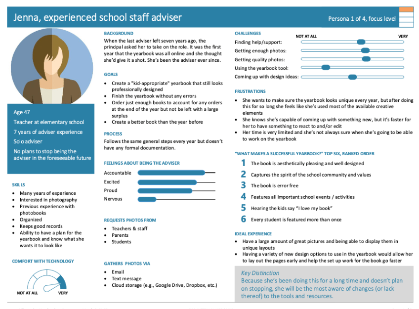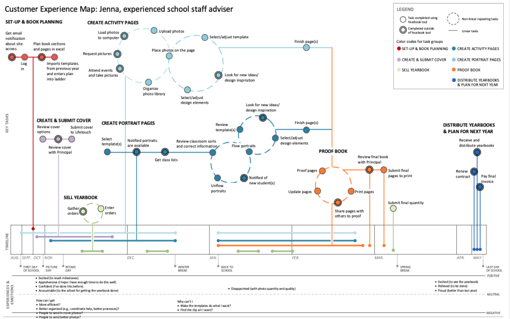 The yearbook business for the client had fallen behind the competition and was lacking a clear vision for where to focus its resources. After extensive research, including heuristic analysis, user interviews and observations, and user surveys, I created a strategic plan prioritizing target markets and audiences, developed research-backed personas, and defined customer journey maps for each persona.