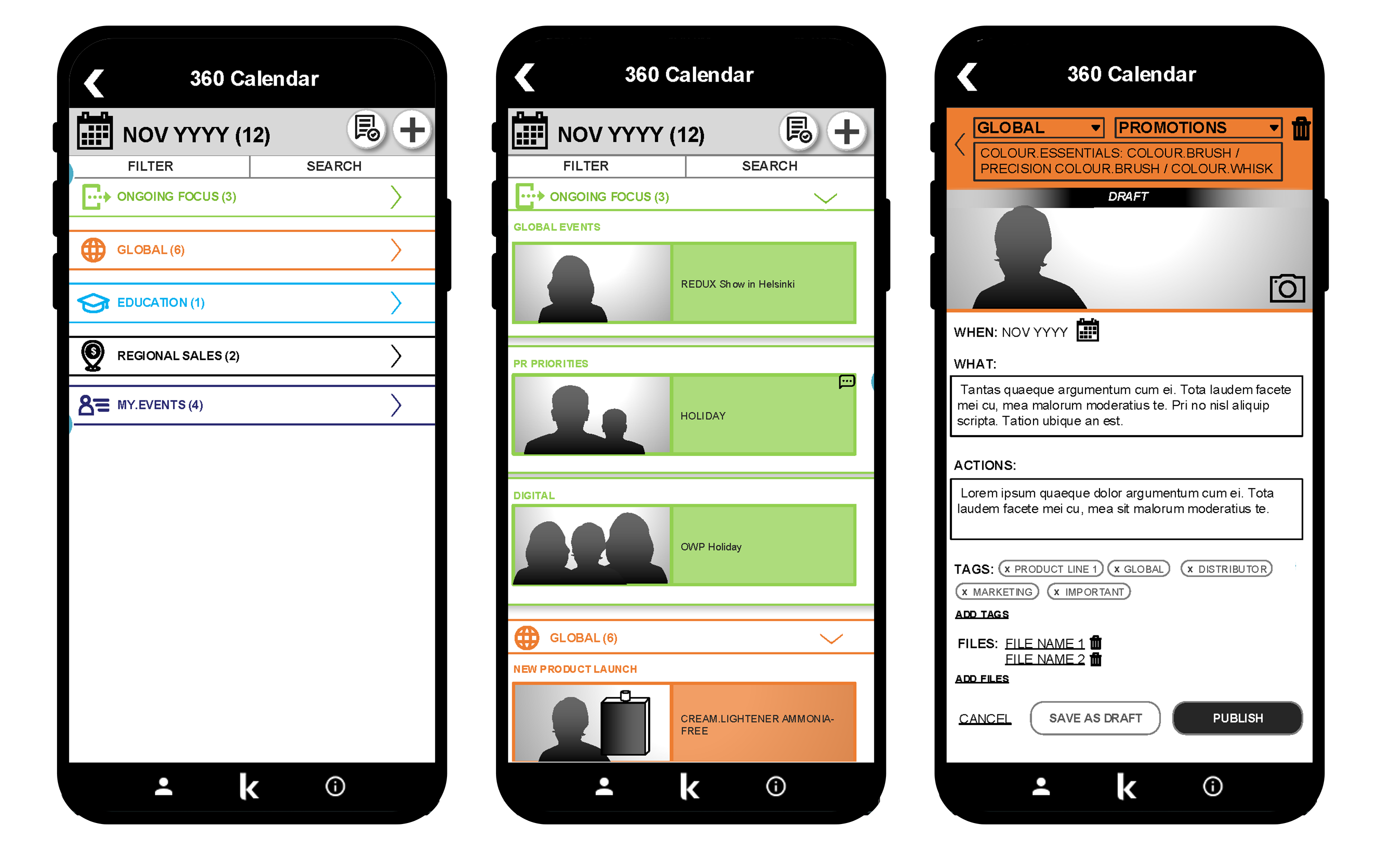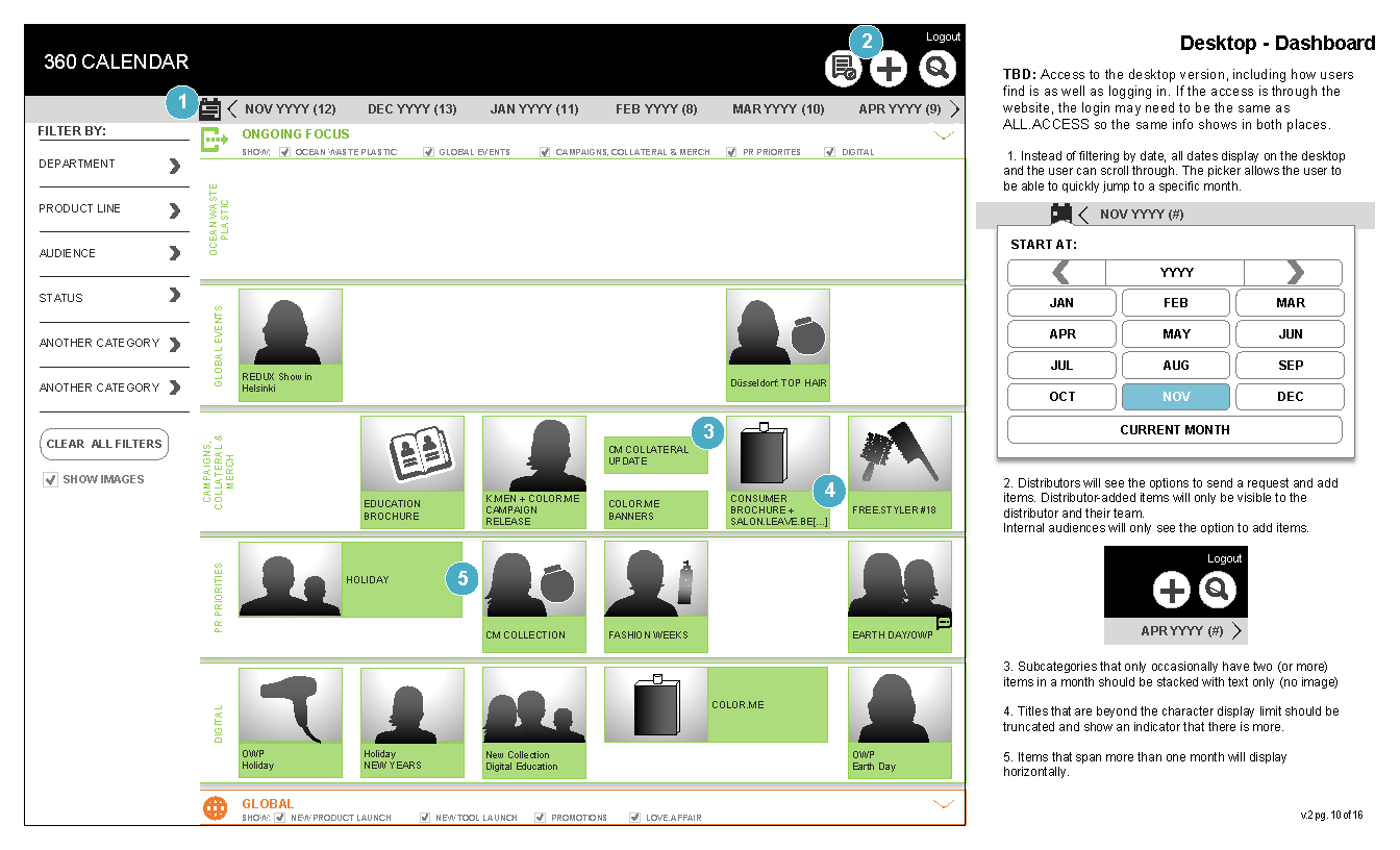 The client requested two interactive experiences, a promotional calendar to support planning, communicating and collaborating and a mobile quiz for training. The quiz is a mobile-web training tool, focused on delivering educational content that is interactive and engaging. The calendar needed to be accessible both internally and by their licensed-salon partners, who are primarily on mobile devices. I created mobile and desktop wireframes with a variety of views based on user-types.
