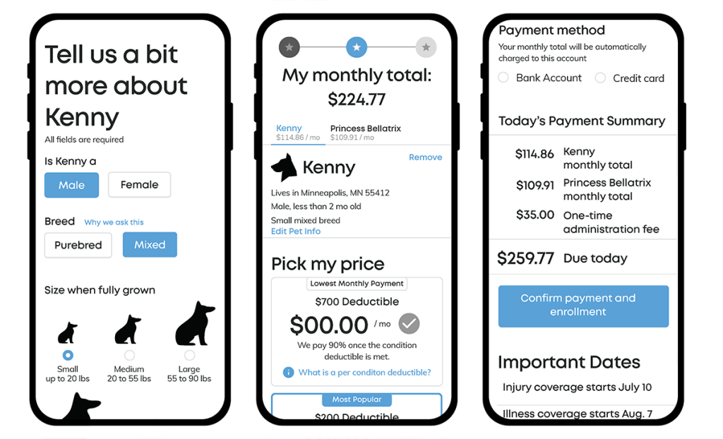 A pet insurance company was looking to revamp its site, including the online checkout flow and secure member dashboard. After defining the information architecture, I created wireframes and user flows that simplified the presentation of a complex product, resulting in a better overall user experience.